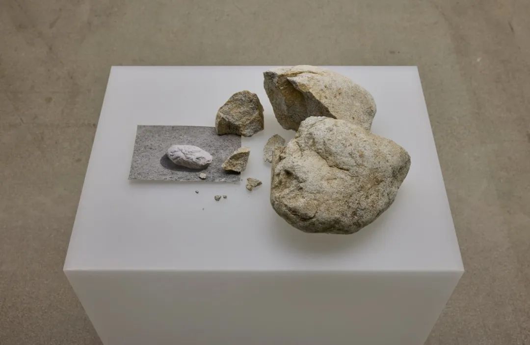作品《无题-7522》(1975年/2018年复制)通过将实际破碎的石头的照片与破碎前的石头并置,来探讨现实(石头)与虚拟(图像)的关系。展现在我们眼前的情形:我们眼前的石头、石头的照片图像和我们心中的石头虽然都被称为“石头”,但它们却又不能不有所不同。对艺术家来说,重要的不是石头的物理特性,而是对“石头”的不同感知和形象的并置,以提醒我们所有的“石头”最终都存在于每个人自己的观念中。