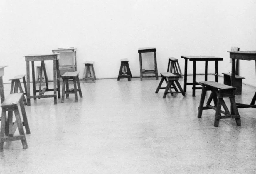 《消失》是件突破性的作品,也是李康昭里程碑式的作品。通过将1973年在普通酒吧中实际使用的桌椅搬到展览馆,重现了酒吧一周的日常生活。他说:“有一天,我的学长来到我的工作室,请我去路边小吃摊吃午饭。突然,我想到‘你看,我能看到我的学长,他也能看到我,但我看不到自己。’就算你转过头,也看不到我的背影。你有你自己的经历,而我坐在这里,有着与你不同的经历,但我相信我们都存在于同一个现实中。这是真的吗?”