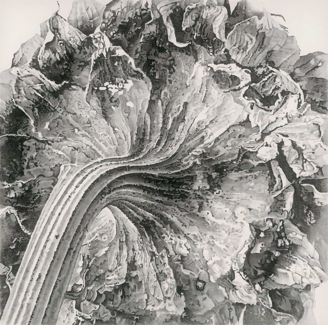 本次个展将呈现多幅艺术家的全新创作,亮点包含逾527厘米宽的《无足之境》,通过科学思维与跨文化视角,重新定义了“山水”作为东方精神载体的当代可能性。画中独特秀丽、隽永优雅之动人结构,不仅仅具有传达山石造型的特性,也将形象转化为莫可名状的幻象,以一种完全不具叙述特质的形式,为山水画重建一种物象之外的新秩序。另一新作《葵花》以水墨纸本的中国传统绘画材料和近似素描的方式将向日葵呈现于画面中。放大的向日葵,以东方水墨的呼吸节奏,融合当代视觉语法,赋予花卉在宣纸上静默而磅礴的生命力。同样也是新作的《小孤山藏石一》,以艺术家标志性的精致工细描绘一方赏石,遥观仿佛有俊俏群峰连绵起伏、层峦叠嶂的气势。画面上方所题写的是明末清初高僧“独立性易”所作的《假山记》,堪称"以文字作画"的典范,将园林美学提升至宇宙观的维度。