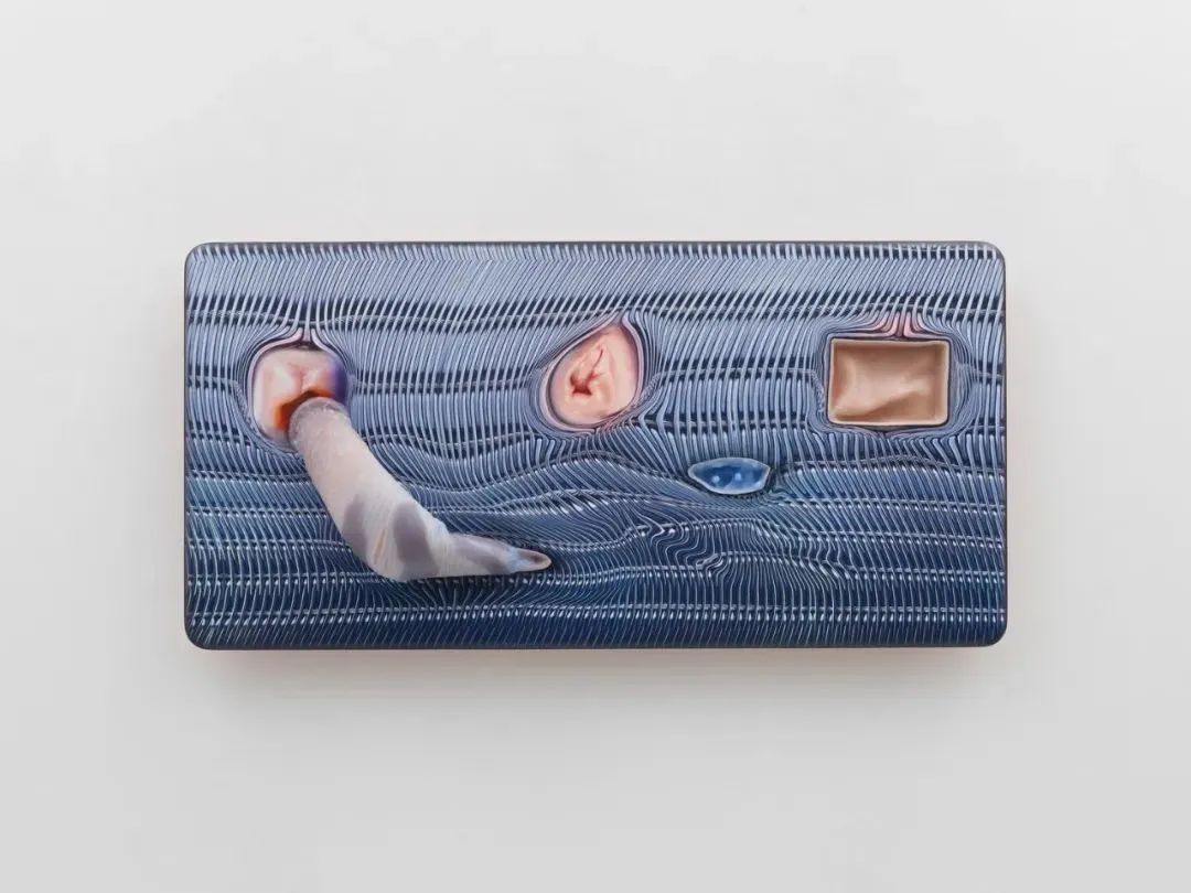 《Mammal-screen-blue》UV 打印、硅胶、油墨、丙烯酸、不锈钢、木材 59.7 x 120.7 x 16.5 cm 2024年