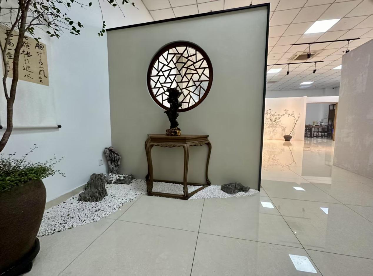 推门而入,细砂铺地,枯山水盆景等凝聚匠心独运的艺术构思,让人瞬间感受到宁静与舒适。200 余平方米的空间内,光影透过镂空的窗棂,与茶席上袅袅升腾的茶香交织,营造出一种静谧而深邃的氛围。