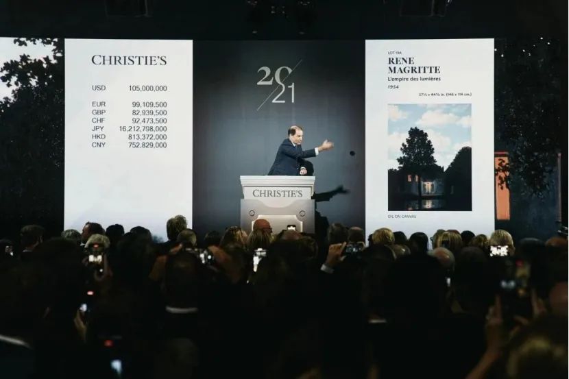 11月纽约拍卖中,佳士得全球私人洽购部主管暨印象派及现代艺术部联席主席Adrien Meyer为米卡·艾特根珍藏的雷尼·马格利特巨作《光之帝国》落槌,成交价高达1.212亿美元,刷新世界拍卖纪录,亦为2024年拍场上最高成交价拍品 | 图片来源:佳士得