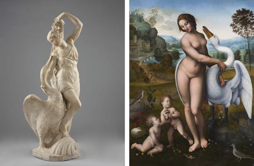 左:阿曼纳蒂(Bartolomeo Ammannati)《丽达与天鹅》,大理石雕塑,高50公分,约1535 年作,佛罗伦萨巴杰罗美术馆藏。丽达与天鹅的希腊神话,因其具有人神结合的戏剧性,而经常出现在艺术和文学大师的作品中