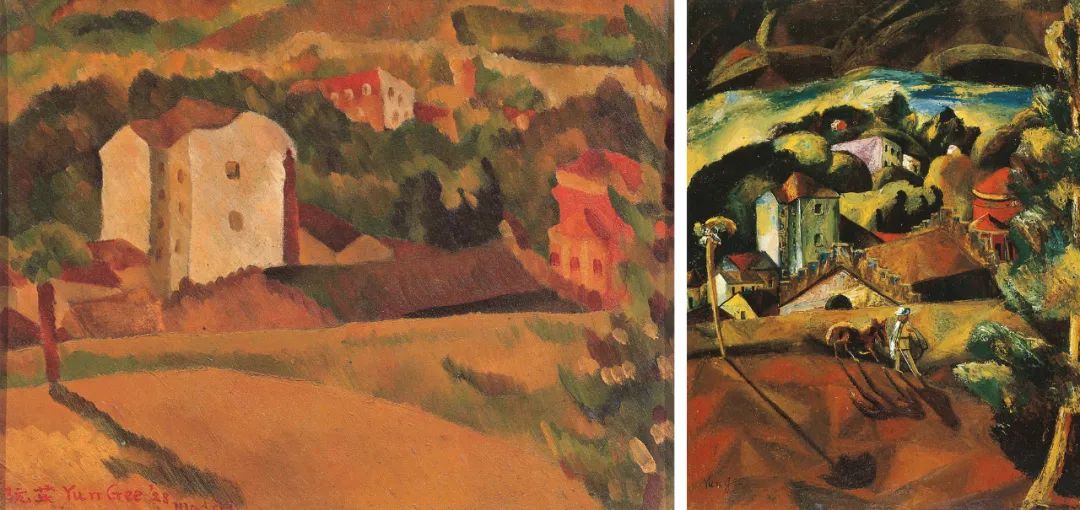 上:朱沅芷《有白屋的马德里风景》,油彩纸板,25.4×33cm,1928 年作,私人收藏;朱沅芷《圣克卢门站》,油彩画布,62.7×48.3cm,1939年作,私人收藏。此二件作品,与是次上拍、完成于40年代纽约时期的《归途》,皆以同样视角下的房屋、山路、河流、树林所作,描绘的现实风景实则不同。3件作品、跨越20年的时间,奇妙地构成系列之环,展现朱沅芷对此景念念不忘的回溯,并以不同艺术时期的风格落于笔端,珍之重之,令此件《无题》别具意义