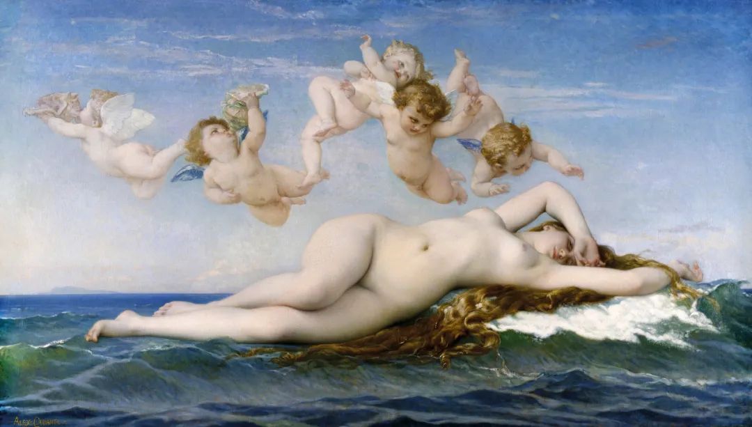 下:卡巴内尔《维纳斯的诞生》,油彩画布,130×225cm,1863年作,巴黎奥赛美术馆藏