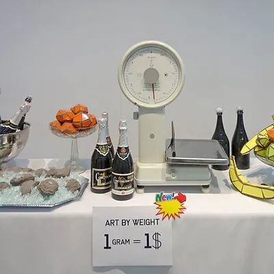 在来自基辅的Voloshyn画廊展位上,她的装置像宴会自助餐的一部分那样陈列在桌子上。混凝土雕塑被制成了生蚝形状的外观,表面粗糙却带有某种奇异的精致感。装饰在旁边的废弃香槟酒瓶与冰块,使它看起来派头十足。桌上更是赫然贴着“艺术称重出售,1克1美元”的标识。