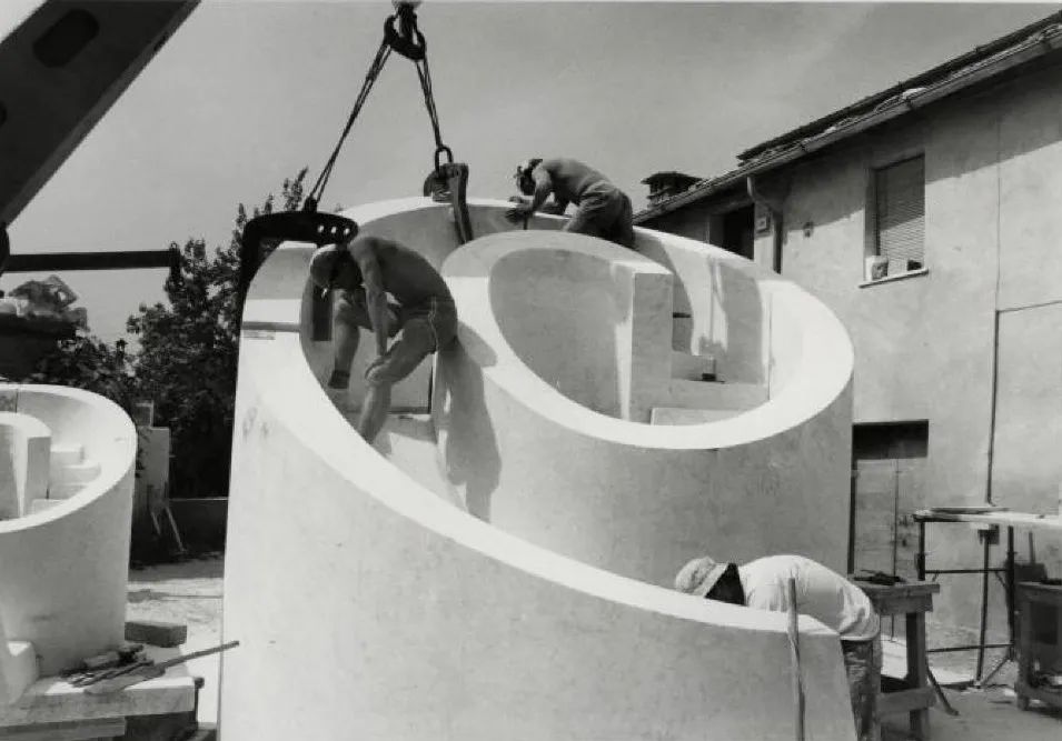 它是一座螺旋楼梯状雕塑,由120吨意大利粗加工大理石雕刻而成。高大的本体无法通过文艺复兴时期留下的低矮行人桥,布展方不得不将其拆卸成8块分别运输。它先是被卡车运到威尼斯对岸城市梅斯特雷(Mestre),然后被吊装到运河驳船。抵达码头,需要把它用起重机载上卡车驮运到目的地,然后再次用起重机卸下组装。
