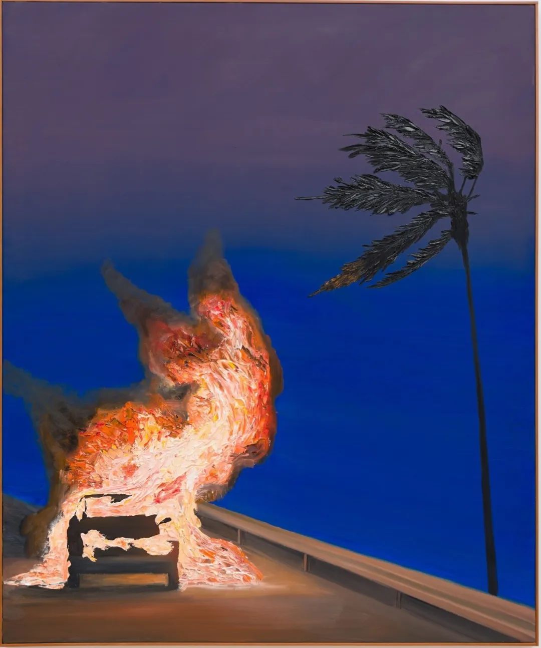 作为洛杉矶历史上破坏力最强的火灾,发生于2025年1月的帕利塞兹山火(Palisades Fire)使许多人的住房和财产毁于一旦,其中就包括艺术家亚历克·伊根(Alec Egan)的家和工作室及20多幅作品。同年在艺博会亮相的《护栏(Guard Rail)》,恰好呼应了这场劫难。沿海高速公路上燃烧的汽车和一棵细长的棕榈树,映衬着烟雾缭绕的蓝天,渐渐消失在夜色中。