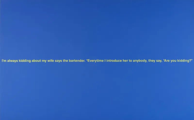 另一件普林斯1988的作品《你在开玩笑吗?》来自艺术家标志性的“单色笑话”系列,文字从左到右穿过宁静的蓝色构图,就像一把隐喻的刀子划过。借由这一系列艺术家既消解了现代主义的严肃面孔,又将反思的棱镜对准了美国社会。