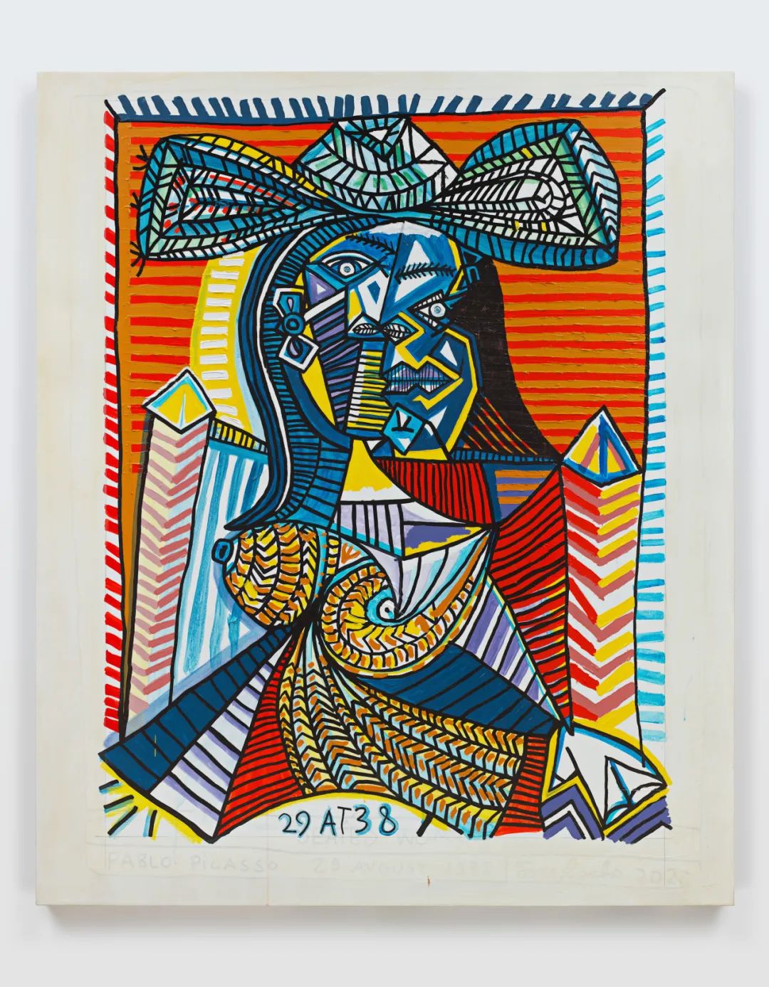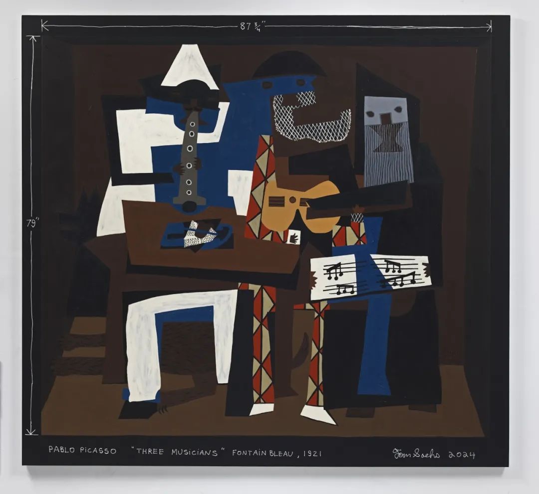 萨克斯作品中反复出现的粗壮黑色线条,源自美国涂鸦和街头艺术的影响,与毕加索在战争时期绘画中用来勾勒人物的黑色轮廓相呼应。此外,他保留了作品的测量线和尺寸标记,使创作过程本身成为作品的一部分。与他早期按原尺寸复制毕加索的作品不同,最近的作品放大了部分绘画的比例,强调复制的过程与意义。