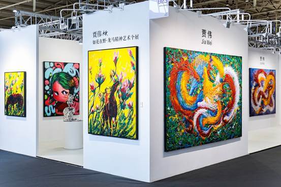 2025 年北京当代艺博会期间, 贾伟 KK 在 D23 展位呈现的 “如花在野・龙马精神” 个展,成为艺术现场的焦点事件。此次展览中,不仅展示了在2024年-2025年创作的《马上如花》系列作品,还重磅发布《如花山海》系列中的《如花舞龙・四》《如花入梦・星空》等新作,实现了将“如花在野” 所象征的 “自由生长”延伸至“本真回归” 的精神脉络 。展览以架上绘画为核心载体,吸引许多机构藏家与当代艺术策展人现场研讨。艺术家 / 演员黄渤、北京当代艺博会主理人 / 演员朱珠等明星好友跨界探展,形成学术圈与大众传播的双重共振。